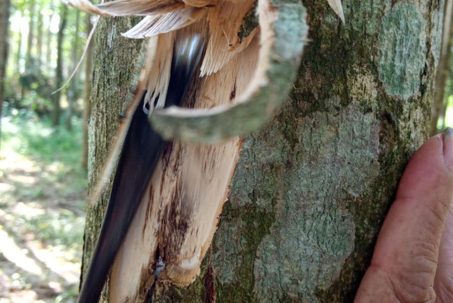Thân cây: Thân cây thẳng, có các rãnh như lòng máng. Lớp vỏ ngoài nhẵn mịn, có nhiều đốm nâu xám và chứa nhiều chất xơ. Cành cây thanh mảnh, cong queo và có màu nâu nhạt. Tán lá thưa. Thân cây có thể cao từ 15 đến 30 mét, thậm chí cao đến 40 mét với đường kính vượt quá 60 cm.