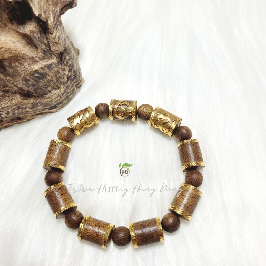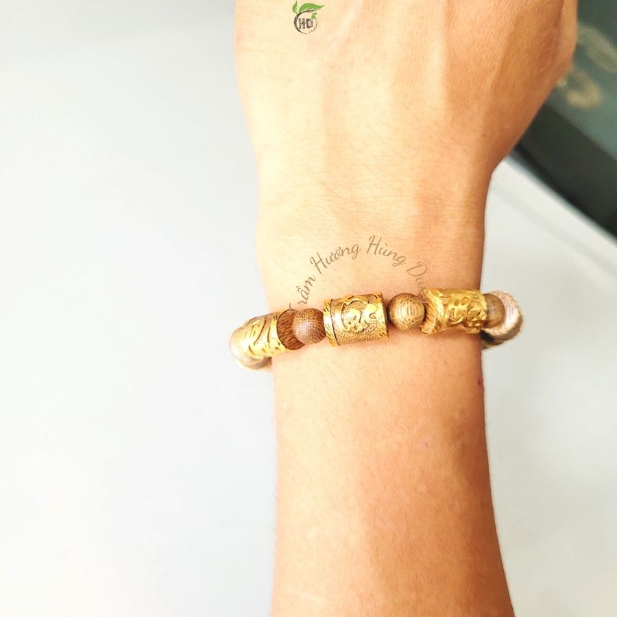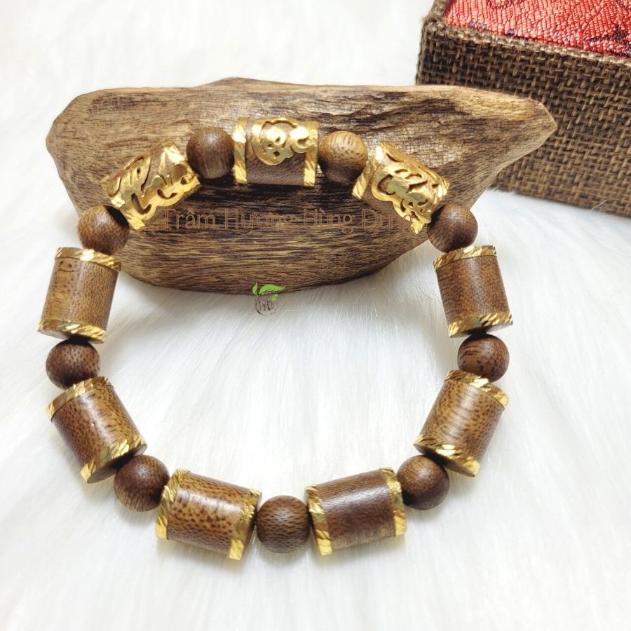 Vòng tay gỗ trầm hương bọc vàng Phúc Lộc Thọ với thiết kế tinh xảo, hạt hình trụ được bọc vàng tôn lên sự mạnh mẽ, quyết đoán. Tinh tế trong từng lớp bọc vàng. Vì là vòng tay phong thủy nên khi đeo, chúng sẽ đem đến sự thanh thản, minh mẫn về trí tuệ về cảm xúc trong công việc cũng như cuộc sống. Đeo một chiếc vòng trầm hương bên tay trái trong các buổi họp, buổi đấu thầu, hội nghị quan trọng sẽ giúp gia chủ gặp rủi hoá may, đạt được sự thuận lợi.